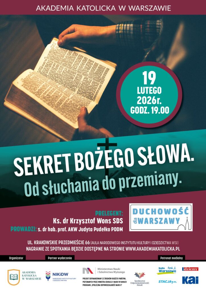 Akademia Katolicka w Warszawie we współpracy z Narodowym Instytutem Kultury i Dziedzictwa Wsi, zaprasza na wykład z cyklu ,,Duchowość dla Warszawy” zatytułowany „Sekret Bożego Słowa. Od słuchania do przemiany”, który wygłosi ks. dr Krzysztof Wons SDS, dyrektor Centrum Formacji Duchowej w Krakowie.