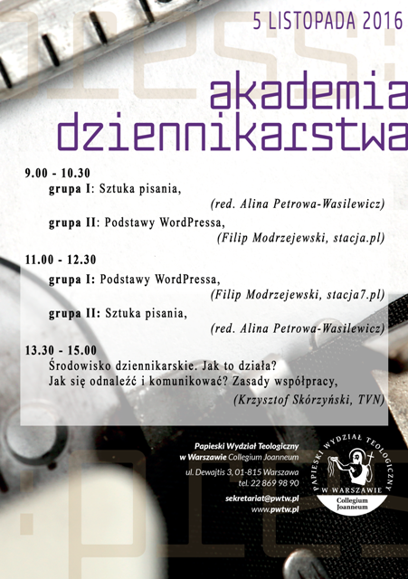 akademiadziennikarstwaWszystkich uczestników Akademii Dziennikarstwa zapraszamy na kolejne zajęcia w najbliższą sobotę, 5 listopada.