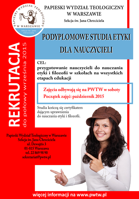 Od przyszłego roku akademickiego ruszają na PWTW podyplomowe studia z etyki dla nauczycieli.Celem studiów jest przygotowanie nauczycieli do nauczania etyki i filozofii w szkołach na wszystkich etapach edukacji. Studia zakończą się certyfikatem dającym uprawnienia do nauczania etyki i filozofii w szkołach.