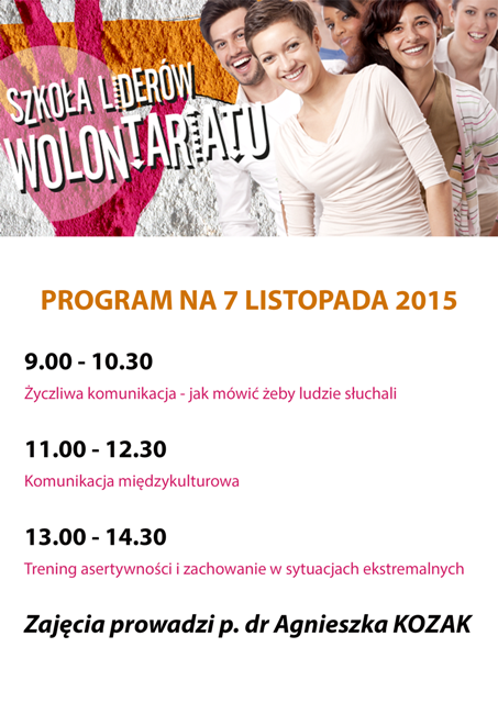 04Uczestników Szkoły Liderów Wolontariatu zapraszamy na kolejne spotkanie 7 listopada. Wykłady poprowadzi Pani dr Agnieszka Kozak.